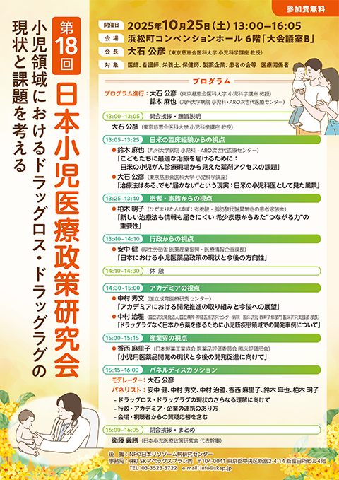 今回は小児医療に於けるドラッグロス・ドラッグラグに関して重要な課題を厚生労働省、製薬企業・アカデミア・患者団体の方々を交えて討論いたします。