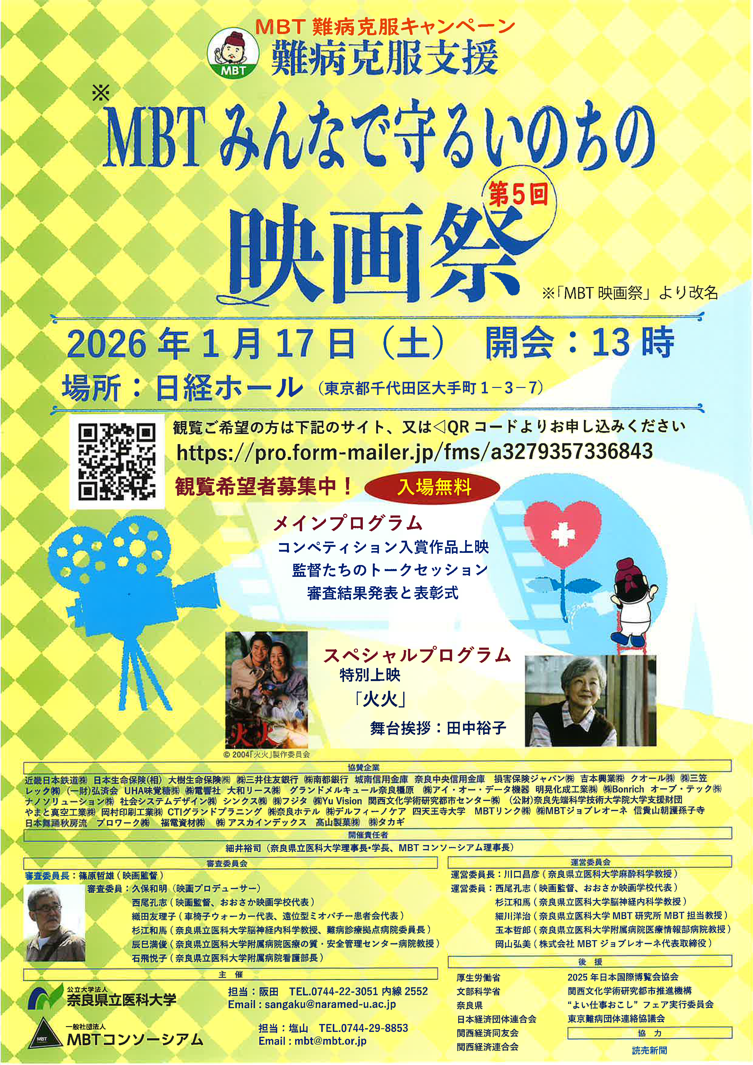 奈良県立医科大学と約160社の企業・団体会員が参加する一般社団法人MBTコンソーシアムが主催する「第5回 MBT みんなで守るいのちの映画祭」が、2026年1月17日(土)に日経ホール(東京都千代田区)にて開催されます。入場無料ですので、ご興味のある方はぜひご観覧ください。