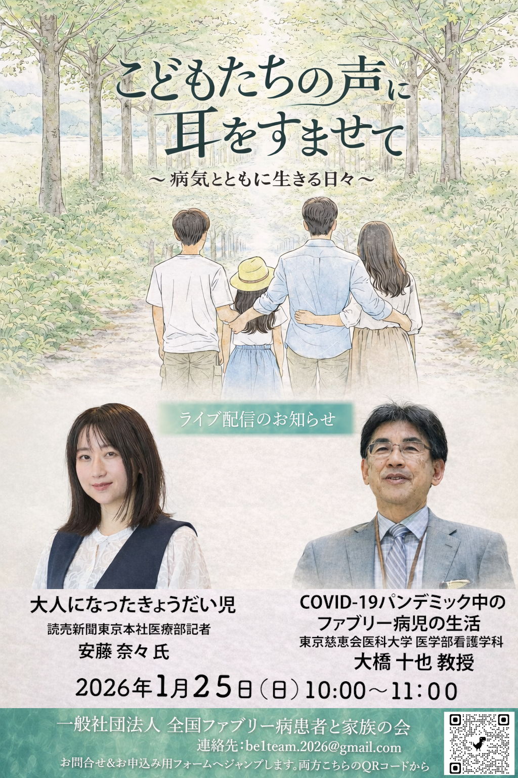 【お問い合わせ・お申し込み】お申し込みはこちらのフォームよりお申し込みください。お問い合わせは、全国ファブリー病患者と家族の会までE-mail:be1team.2026@gmail.com